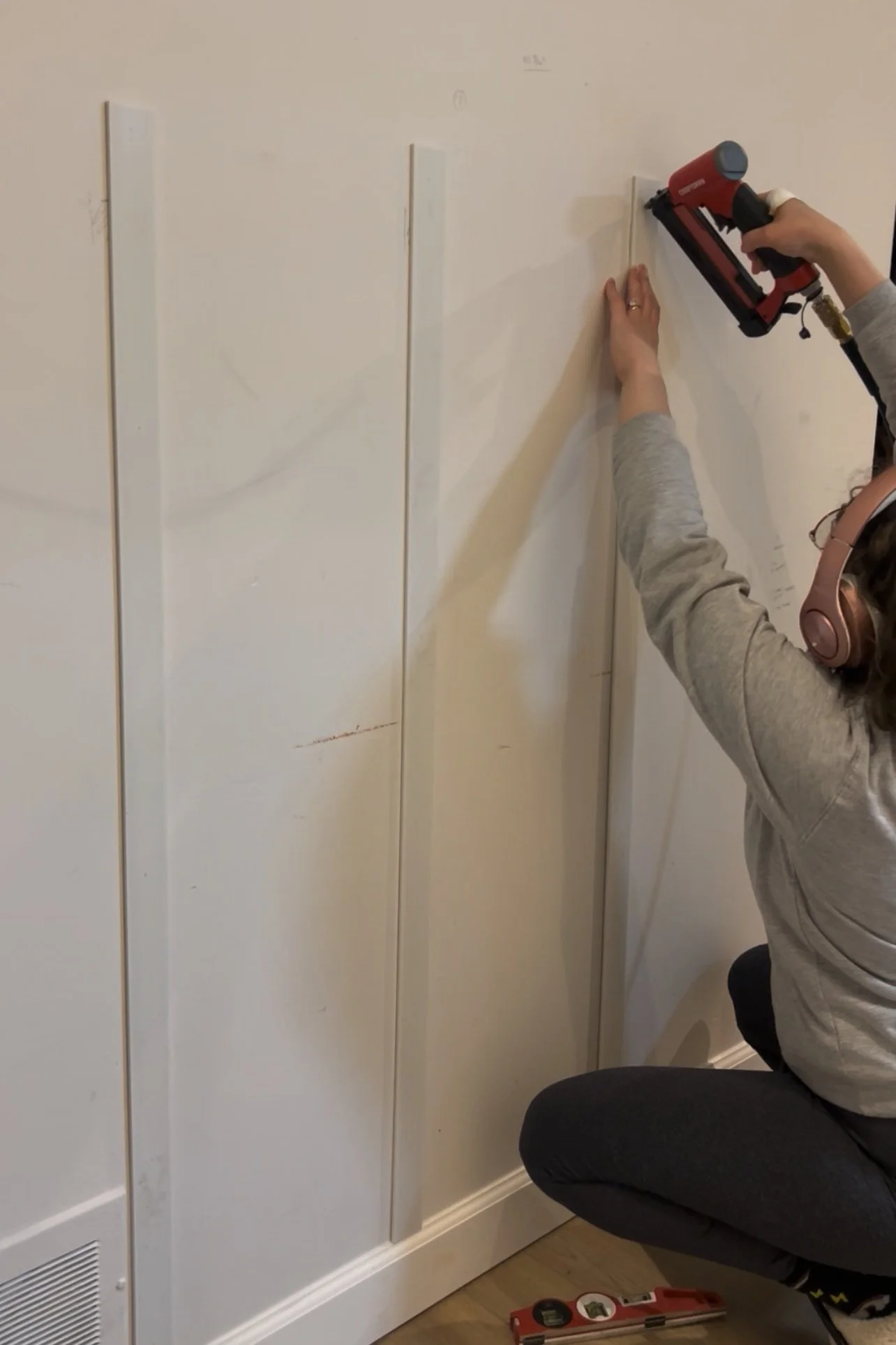 Next, we used a brad nailer to secure them to the wall, checking with a level to make sure each piece was straight.