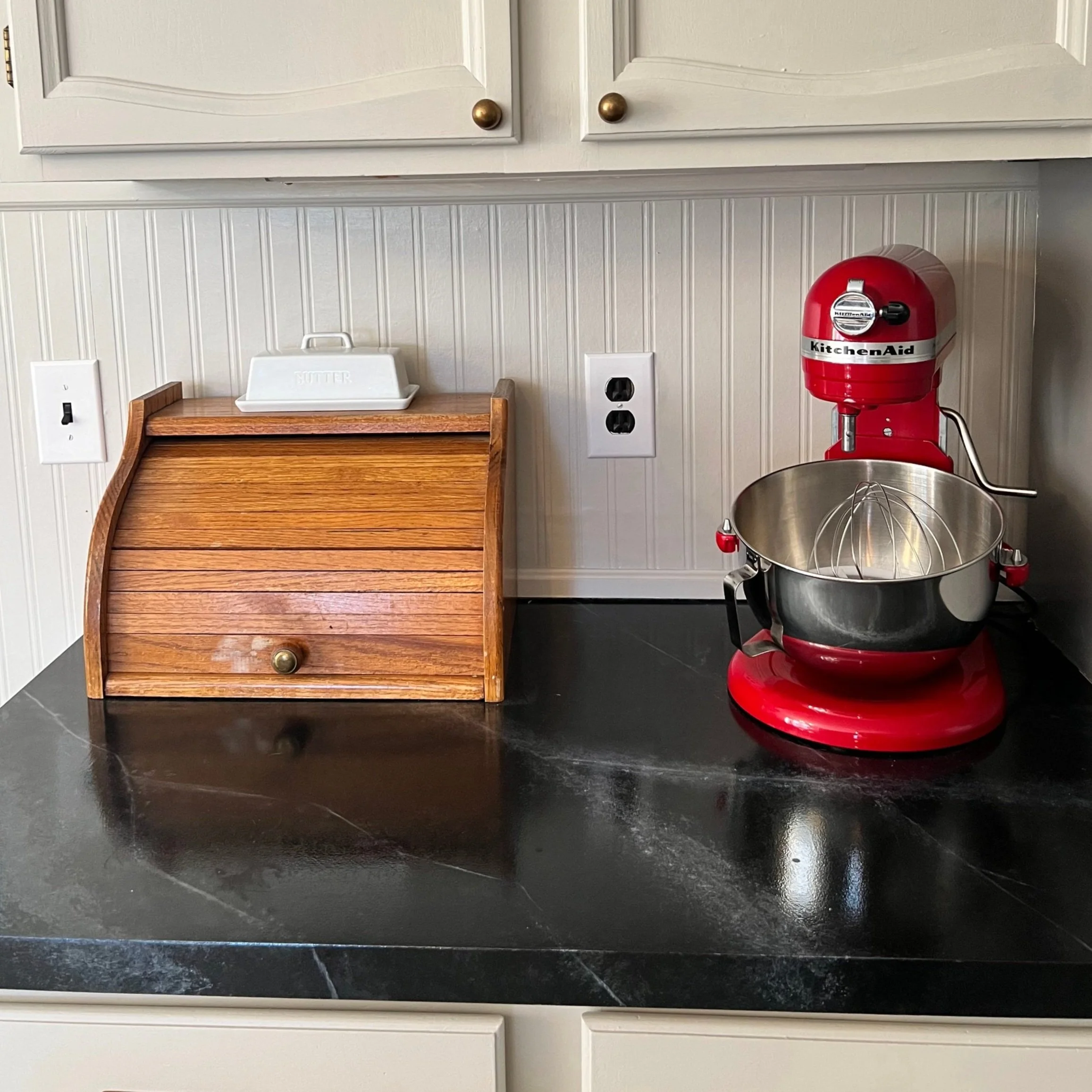 One of the first projects that we tackled after buying our 1980’s fixer upper was our kitchen refresh. This included painting our kitchen cabinets and updating our laminate countertops with a concrete feather finish.